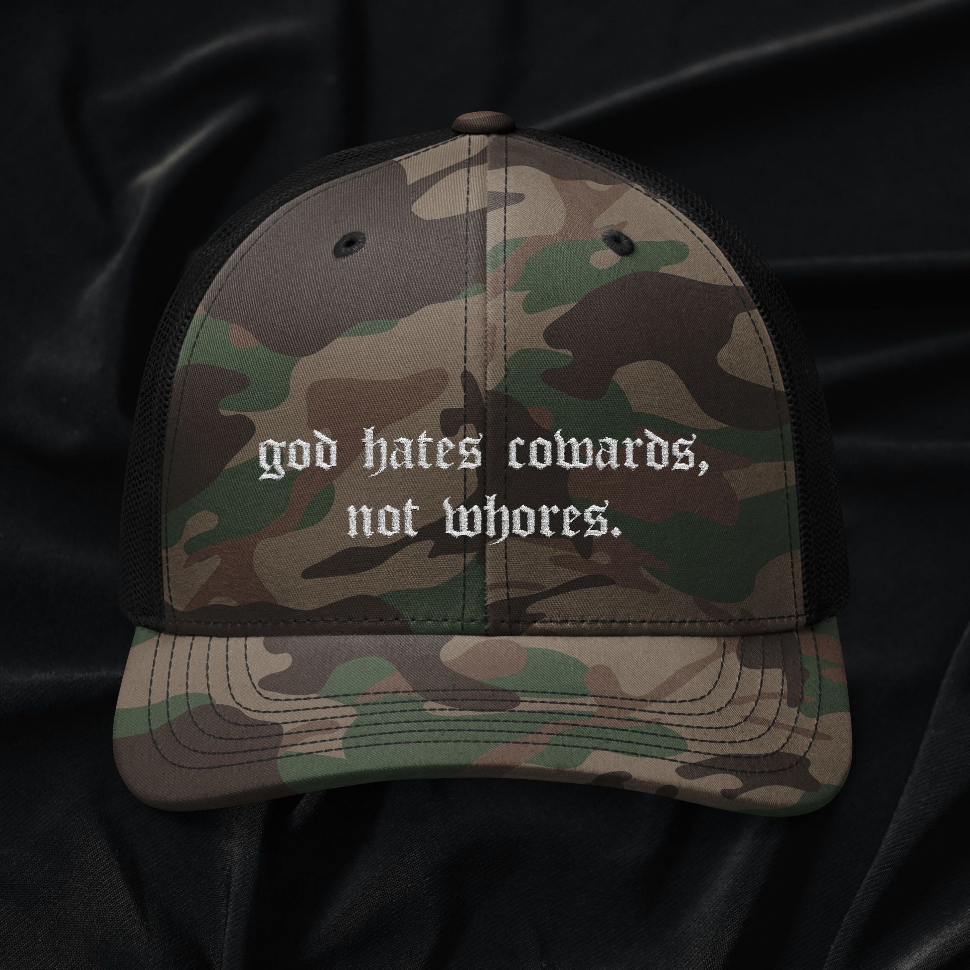Cowards Not Whores Camo Trucker Hat (Embroidery)